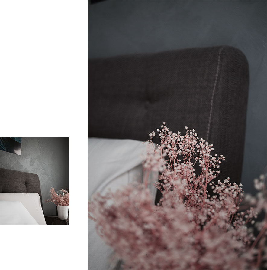 Ich hab da dieses Ding mit weißer Bettwäsche, mit gefühlt Millionen Kissen und hier hab ich eine Krümel-Phobie. Eigentlich bin ich hier fast immer Offline, mit dem Smartphone und dem Kopf, manchmal ist es mein Office. Es ist mein SOS-Plan, wenn ich Migräne hab – meeeeh. Und es ist das, wo ich Pläne plane. Hier passiert neunzig Prozent Cat Content und vielleicht noch maximal eine Pizza aus einem Karton. Hier bin ich, wenn irgendetwas doof ist, weil ich mich hier unter der Bettdecke verstecken kann, bis es weg ist. Und wenn ich sortieren muss, meinen Kopf oder irgendeinen Plan B.